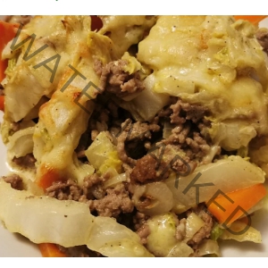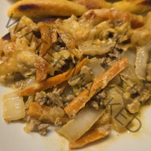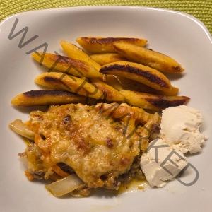 Hier habe ich kein extra Bild von unserem Essen, denn es sah genauso aus. Dazu gab es Nudeln. Allerdings hatten wir nur zwei Schichten – das kommt halt auf die Größe der Auflaufform an.